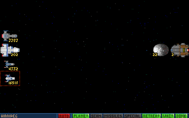 What you see above is a pretty lop-sided battle sequence, but one that highlights how space combat works. Because dedicating a massive playfield to bringing each of those ships into real space would’ve destroyed the 386-range PCs of that era, there are six slots on each side of the screen for, dun dun dun, your six different ship designs. If you have more than one ship of that design in a group, it ‘stacks’ them and then doles out the damage as if there were really a thousand ships attacking, rather than what looks like a single ship with a ‘1,000’ next to it. It’s a simple model and as a result, most ship battles go pretty quick. It’s on this battlefield where you start with primitive nuclear weapons and work up to black hole generators that suck up random quantities of enemy stacks into the ether. In both shots above, my fleet was so overwhelmingly large and overpowered that allowing them to bombard the Bulrathi colony would’ve pretty much liquidated the entire surface.