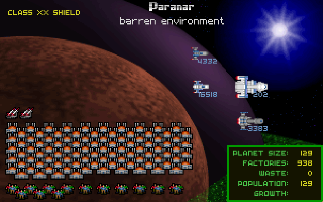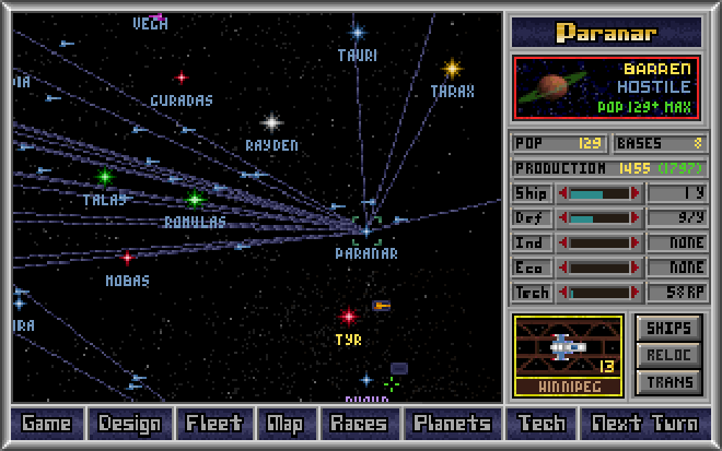 I mentioned in my video review for Rise of Nations how innovative it was to have an infinite queue in sync with staging areas: your factories would produce an unlimited supply of units, provided they had enough resources, and then ship them off to a staging point to better allow you to project your power. I must admit I had totally forgotten about Master of Orion and one of my favorite end-game tactics in which I would surround the last of a dying race’s worlds and mount up an insane amount of hardware, ready to crush any opposition lickity-split. All those streaks you see above were pain-stakingly redirected from each individual colony to Paranar there. Not as elegant as Rise of Nations‘ solution, but coming out a decade earlier, I’ll forgive them.