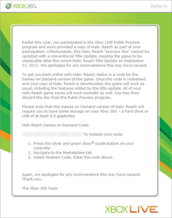 Well there was an update to Halo: Reach on September 21st that made those who used the preview disc unable to play the game anymore. Instead of Microsoft just saying whatever, the testing is over they don’t need the game anymore, they sent out a Games on Demand code to download the full game to your hard drive!