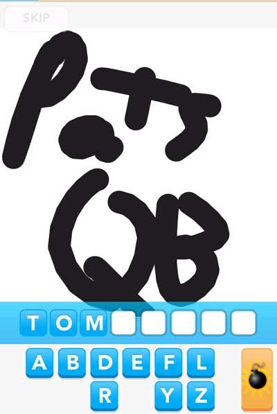 Who said you just had to draw pictures? Whenever possible, cheat. While there’s nothing in the game that guards against just spelling out the clue entirely, that’d just be cheating and hardly any fun. How difficult would it be to do TomBrady without words to contextualize it? Very difficult, and I don’t care how much you love sports.