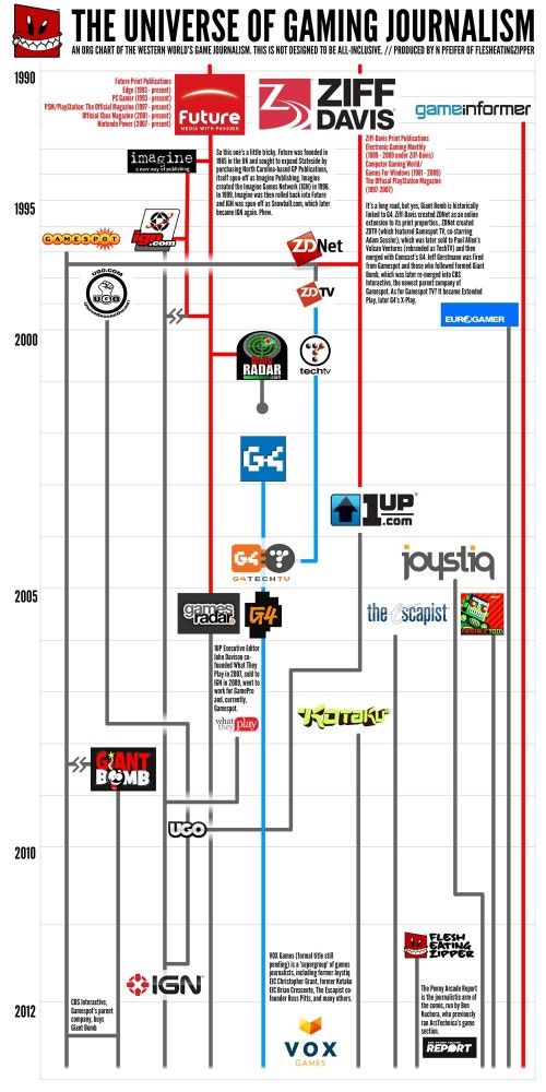 It actually came across as pretty astonishing that while much of the talent in the industry is borne of sites by current gaming print mogul Future or past print mogul Ziff Davis, those sites have consolidated down or have been washed away by the sands of time. 1UP in particular suffered massive exoduses of talent at the hands of bad mergers by terrible parents, leading it from what was once an epic gaming site to nearly vestigial. While many journalists have stayed in the biz, many have also moved onto roles at developers and publishers as well. So here, at a glance, is the shape of gaming journalism over the past twenty-plus years.