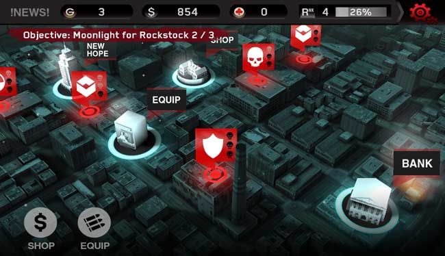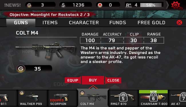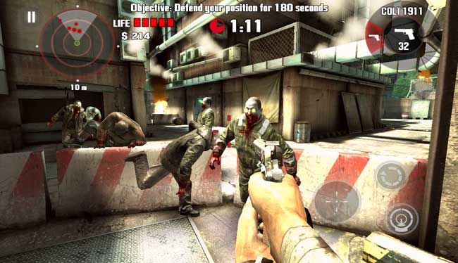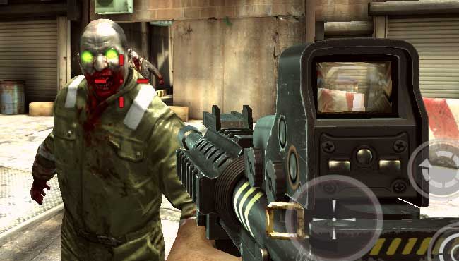 The missions are mercifully bite-sized adventures, and have you either killing all the zombies in a level, defending a point, or retrieving boxes from arriving helicopters. The main quest line advances the story, but you’ll find yourself in many of the randomly generated missions just so you can earn enough cash to buy your next piece of gear. Optimized for nvidia’s graphics chips (although it ran just fine on my PowerVR-equipped Galaxy Nexus), the game is definitely a looker with framerates only stuttering on loads and keeping silky smooth throughout. The levels aren’t large, but they offer more variation than, say, Dead Space’s did. The interface is also polished and functional, but there are spelling errors abound.