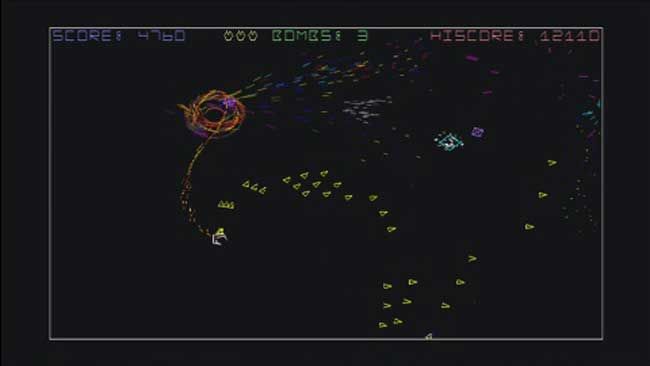 The first enemies Cakebread implemented were grunts, blue squares that slowly chased the player’s ship. The purple split three enemies were inspired by Asteroids and, naturally, split into smaller foes when shot at. These smaller versions would begin to circle because, as Cakebread explains, it would be far too easy to wipe them all out in a dash if they weren’t slightly evasive. Geometry Wars originally featured a single static gravity well in the center of the arena that worked to clear the arena of enemies, modeled off one of the first video games, 1962’s Spacewar!. There, two players squared off around a star that could pull in the ill-equipped at a moment’s notice. In fact, gravity wells didn’t begin to move and interact with each other until later in development, when he says they looked cool. “Players would see these gravity wells swirling around each other and be ‘oh fuck!'” Green lattices called weavers ruthlessly dodged your ammunition, although an early bug allowed them to be easily dispatched with a specific spray downward and to the left as they simply weren’t programmed to evade in that direction.