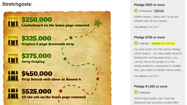 With only five days left, Penny Arcade’s Kickstarter experiment to ditch their ad model and free up their time to work on Penny Arcade content looks to be coming to a somber, underwhelming finale. Despite the webcomic empire’s popularity, the epic fanfare, and coverage by Forbes and Fortune (our site excluded out of modesty), it’s been passed up left and right by other Kickstarters for the crowd’s dollar and has spent most of the month-long campaign barely matching the contributions of its first few days. There’s still a great chance that it’ll ramp up at the last minute and they’ll still walk away with at least three quarters of a million dollars, but the lack of excitement around the fundraiser is crisp in the air. It’s clear from here that there just wasn’t enough planning in this venture to reward the company the full million dollars they dreamt of. So what went wrong?