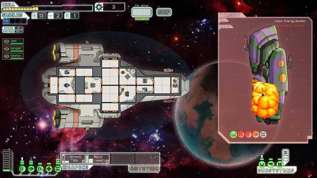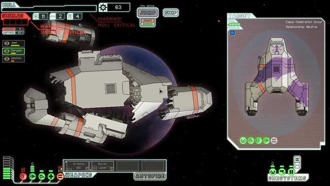 You’ll manage your ship room to room, some representing your ship’s subsystems. As you enter combat, they’ll get knocked offline and you’ll need to send your crew out to repair them like a lo-fi version of The Sims. Meanwhile, you’ll be ripping on your enemies in the same way, damaging and destroying their oxygen supplies, shield generators, and so forth. As you progress, you’ll find the struggle to maintain a stream of firepower at your enemy while making sure your ship can continue to deliver that deadly payload becomes an incredible feat of micromanagement. If foes manage to board your ship? Well, good luck.