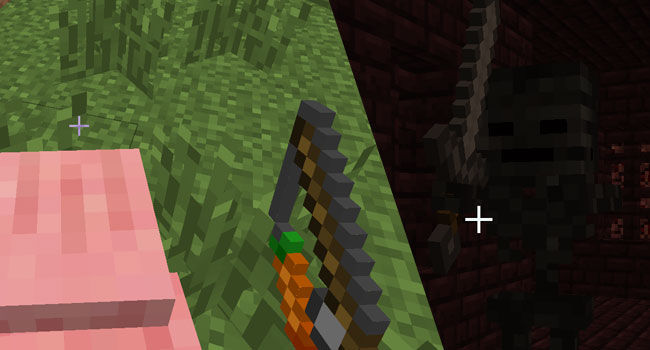 In a previous snapshot carrots and potatoes were added as a crop to grow and now they will be seen growing in villages. Grab a fishing pole and a carrot, put them together and now you have a carrot on a stick. This will allow you to control the direction of a pig you are riding (also causes other pigs to follow you). I think the controlling pig needs to be tweaked a little bit because right now they will drop off a cliff if you point them in the right direction and they wont jump. Once you’re stuck you can jump of the pig and climb out and it will follow.