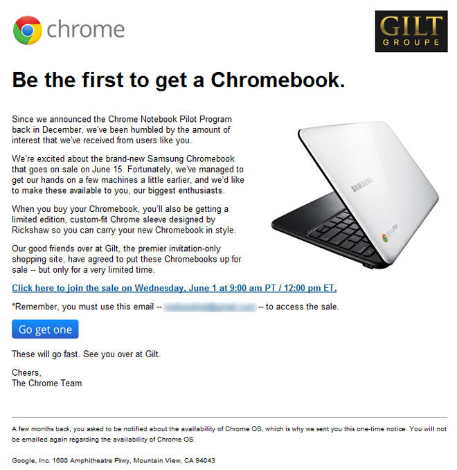 I’m sorry it’s too late, they’re all sold out. I got the email early yesterday morning, was busy all day and you wouldn’t have been able to get one unless you got the email so don’t blame me for late news. I wouldn’t have bought one anyway and not for $500, what are they smoking? Anyway Chromebooks officially go on sale June 15th but today Google put up the Samsung Series 5 on Gilt Man.
