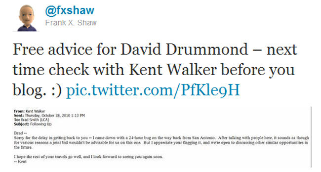 “But wait!” you say, “This could all just be a bunch of shenanigans by Microsoft, intended to make google look bad!”. Well, I’d think that may be the case, too, if I hadn’t seen the next tweet, by Frank Shaw – Microsoft’s head of communications, complete with an email sent by Kent Walker – Senior VP and General Counsel for Google.
