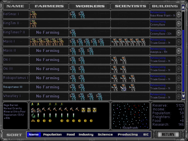 Rather than an abstracted, ‘more is more’ methodology, each colony now has discrete buildings that aid defense, give ecological bonuses, allow you to build bigger ships, and so forth. Taking the place of the planetary slider mechanics is the ability to divert individual units to a smaller amount of jobs: farming, labor, and research. While diverting your colonies’ workloads isn’t as nebulous here, it does feel more tedious. The new Colonies screen allows you to shape the workforce of your empire much quicker, which is awesome. Speaking of money and labor, you see those glowing grey seals in the far right column of the Colonies screen? Those are ‘Buy Now’ options. Have enough money and you can expedite virtually any project to a next turn completion, which is a great (if terribly expensive) way to rebuild lost fleets or planetary defenses, or get your foot on more fertile worlds than your opponents. Probably one of the best features of the game.