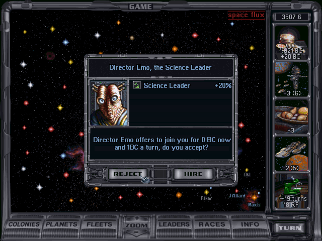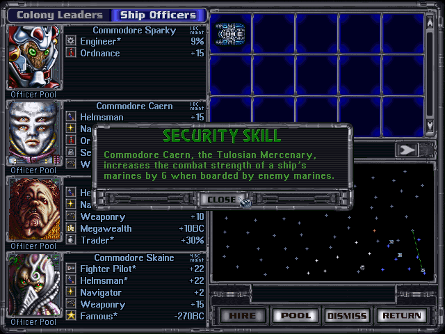 Joining you on your adventures are Leaders. You get prompts like the one above for the nearly talentless Director Emo above, but you’ll get some pretty talented (and expensive) ones as you go along. Employ them on your colonies or your ships and they modify their properties, but at a glance, they come with a weird gargle of random stats, which is thankfully boiled down with some helpful right-clicks. Colonial leaders made far more sense in my years playing the game because I rarely lost colonies. Sticking those expensive buggers on ships that I knew were probably going to be slaughtered in the field of war seemed a bit less productive, or even sensical.