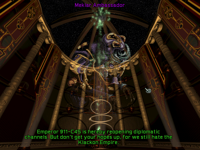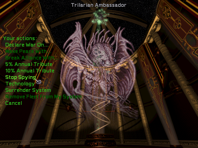Diplomacy is much more flashy and nuanced in Master of Orion 2. If those (normally nice) Trilarians just won’t stop stealing your tech, you can tell them that specifically, rather than just, y’know, declaring war on them. They show their changing moods toward you better this time around, but all are predisposed to love or hate you from first glance.