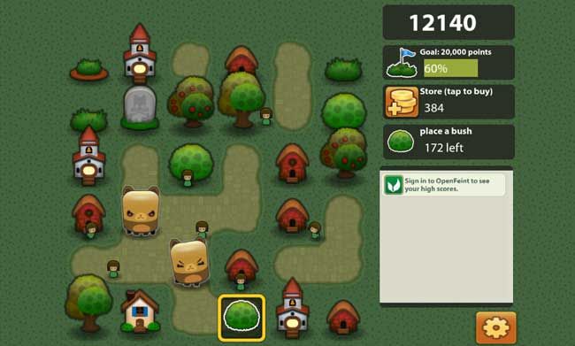 While it’s not quite SimCity, you’re tasked to build a settlement on some random plot of land. With each turn, you place accouterments that, when grouped together in lumps of three or greater, consolidate to form higher-tiered components. Place three shrubs and they become a bush. Three bushes become a tree, on and on up the line until you’re dealing with civilization. If you’ve played Bejeweled or Hexic, you know how this works, but rather than giving you a full landscape to deal with, you must decide where to place your shrubberies and houses on a nearly empty slate to generate optimal upgrades.