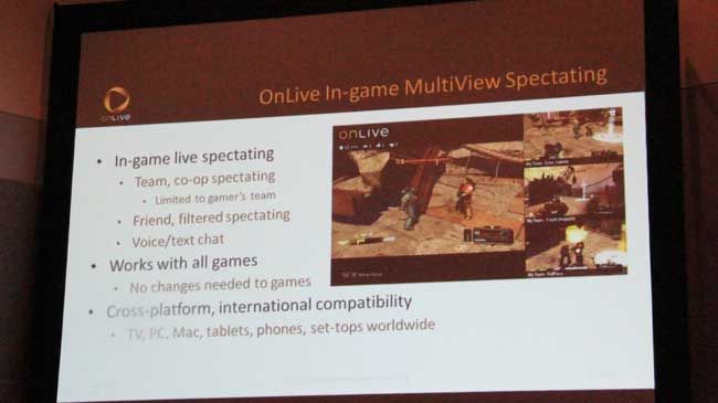 - True cross-platform functionality. Steven brought up examples like EVE Online with Dust 514 and the Wipeout games to demonstrate that games were being played between several consoles or between the console and the computer, but these are rare instances, or only for very specific functions, like swapping items. With OnLive, virtually any device that can play video (with roughly the same technical requirement as running Netflix) can play high-end PC games. Steve also demonstrated a new MultiView feature in which you can spectate on three other OnLive players at a time. Again, there’s no extra hardware required on your end as the image is being generated by OnLive. He showed off playing Borderlands 2 with a trio of cooperative partners, then switched one of his panels to a friend playing another game entirely. It was pretty sexy.