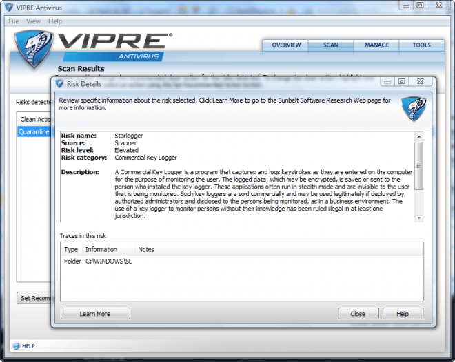 Well after some digging F-Secure found out that VIPRE was just looking for folders or extensions called “SL” and that was throwing the alarm. Apparently Starlogger uses that extension and VIPRE has an aggressive scan which looks for stuff like that. From what VIPRE said that scan is rarely used and any results should be put under a peer review to make sure they’re not false positives.
