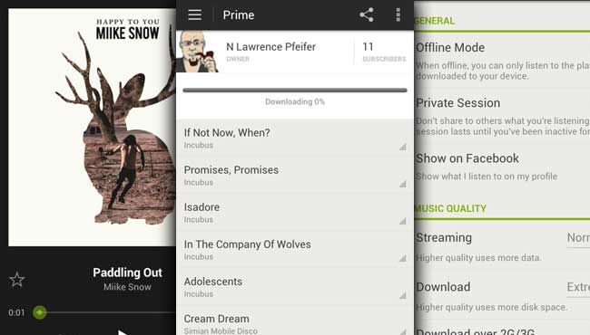 + Better Interface. Along with the ICS components, the app looks and feels a lot better overall. Menus slide out in-line under items you touch, artists have better pages to collate their music and biographies, transitions look fantastic and are usually smooth (more on that in a sec), leaving the app feeling like the experience it should’ve always been, a true 2.0 experience. It also boasts the standardized list button in the corner to access the rest of the app, rather than dominating space at the bottom. When you start playing a song, it appears in a mini-player strip along the bottom of the app. Clicking that brings up the full view with scrubber and album art. This means you have persistent pause/play controls as well as song info as you surf through the app, something that was tucked away in a huge slide-out tray before.