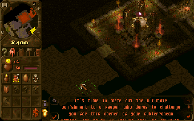 Anyway, your workforce is a group of summon-able imps that go around carving out the earth, harvesting your gold, and fortifying your dungeon’s walls to prevent punks from caving into your spaces. Maps are grid-based, so you tag squares to make them “gold” to lure the imps. Be wary about your usage, however: terrain mined away can’t be replaced. I know at least one mission forces you to build your entire dungeon in an open space, but use walls to your advantage: namely, the ability to lock away rooms with doors.