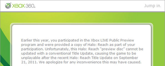 Well there was an update to Halo: Reach on September 21st that made those who used the preview disc unable to play the game anymore. Instead of Microsoft just saying whatever, the testing is over they don’t need the game anymore, they sent out a Games on Demand code to download the full game to your hard drive!