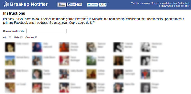 Don’t lie, I can’t be the only one. If you got your eye on some lucky gal/guy on Facebook but they are “in a relationship” I got just the thing for you! Breakup Notifier will monitor your crush 24/7 and as soon as they change their relationship status to single they will email you so you can be the first to comfort her/him. According to TechCrunch the creator “Dan Loewenherz was sitting up one night with his fiance and his mom, trying to conjure up a guy to set up with his fiance’s sister. They finally came up with the perfect guy, enthusiastically checked the guy’s Facebook profile and to much disappointment, saw that he was in a relationship.”